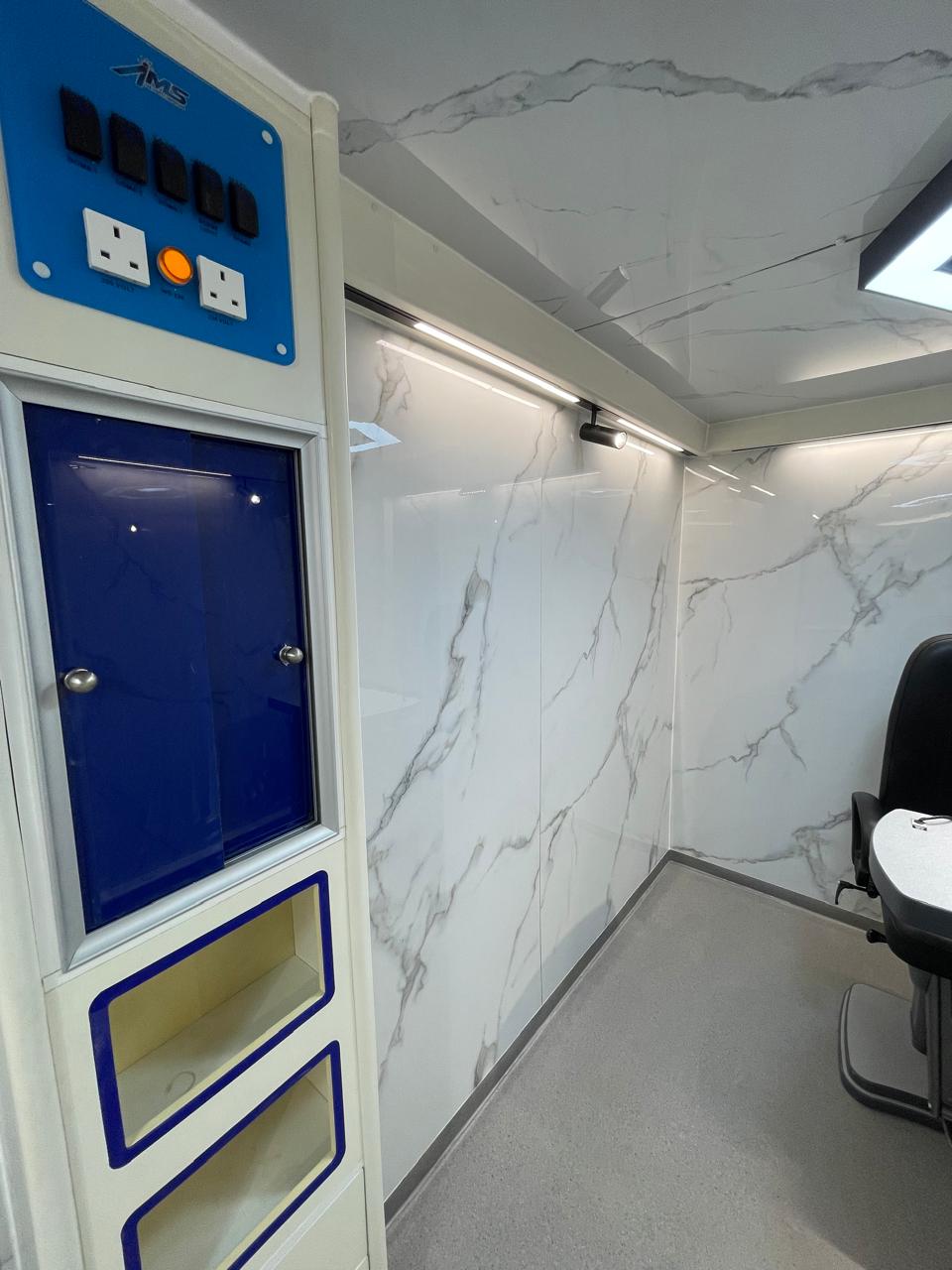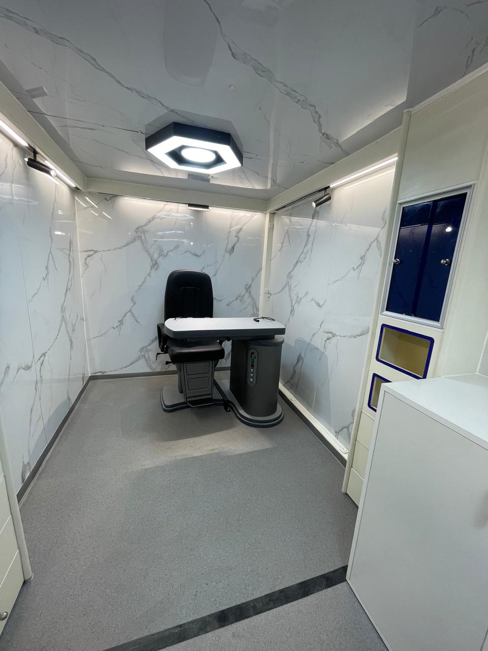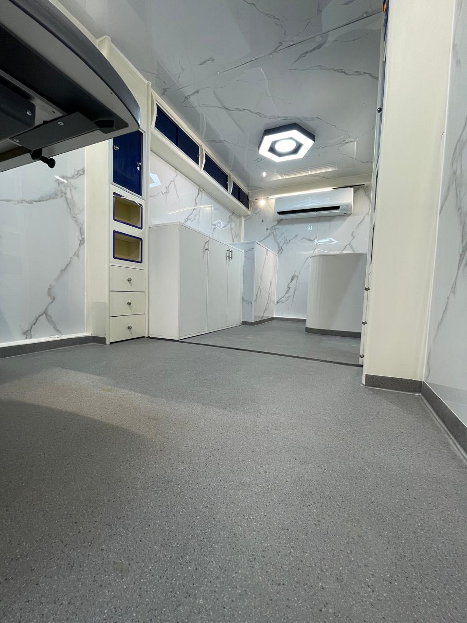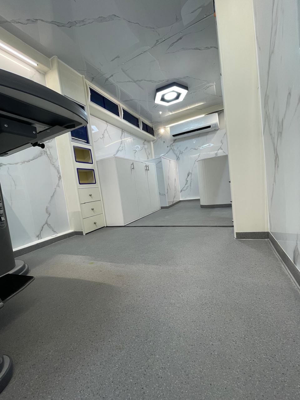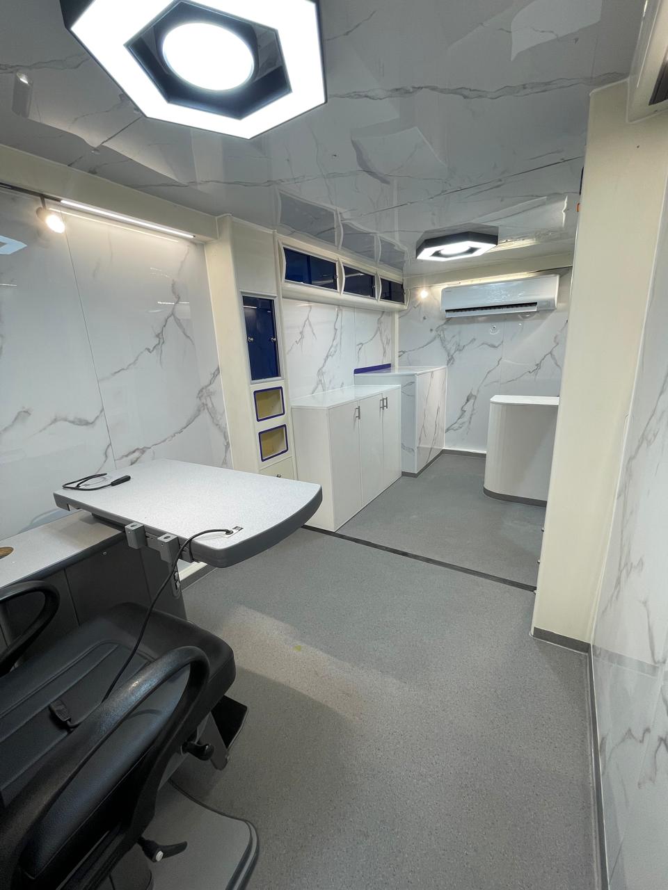 تصفيح خلف الوحدات، ستائر للنوافذ، وفواصل داخلية تفصل بين كابينة السائق والجزء الخدمي، بالإضافة إلى فاصل بين العيادات لضمان الخصوصية والتنظيم.