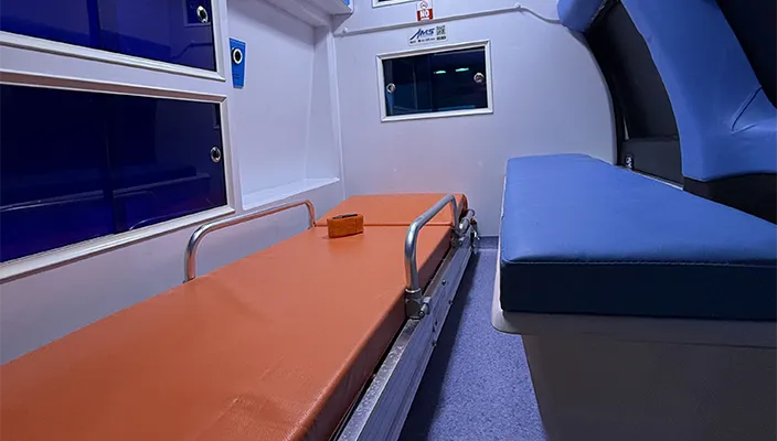 تصميم سقف داخلي من مادة GRP مزود بإضاءة LED مدمجة، وخطافات لتعليق محاليل الوريد (IV)، وقضبان إمساك من الألومنيوم، لضمان إضاءة مثالية وحركة آمنة داخل المقصورة.