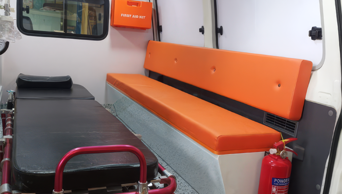 تصميم سقف داخلي من مادة GRP مزود بإضاءة LED مدمجة، وخطافات لتعليق محاليل الوريد (IV)، وقضبان إمساك من الألومنيوم، لضمان إضاءة مثالية وحركة آمنة داخل المقصورة.