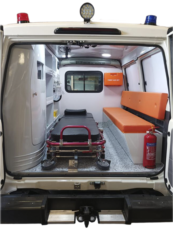 مقصورة داخلية معززة من مادة GRP مزودة بتخزين طبي، ونظام أكسجين، ومقاعد مريحة مصممة وفق أسس هندسية، لدعم العمليات الطبية بكفاءة في بيئات الطرق الوعرة.